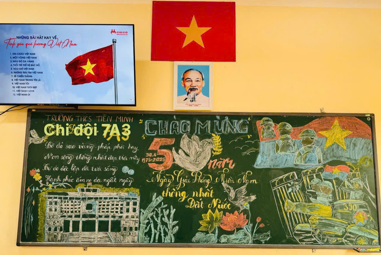 Hòa chung không khí vui mừng, tự hào của cả nước nhân 50 năm Ngày Giải phóng miền Nam, thống nhất đất nước (30/4/1975 – 30/4/2025) và 70 năm Ngày Giải phóng Hải Phòng (13/5/1955 – 13/5/2025), thầy côvà trò Trường THCS Tiên Minh đã phát động nhiều hoạt động ý nghĩa. Trong đó, phong trào thi đua vẽ tranh trên bảng giữa các Chi đội đã thu hút sự tham gia sôi nổi của đông đảo học sinh. Ngay từ khi phát động, phong trào đã nhận được sự hưởng ứng tích cực. Các Chi đội cùng nhau lên ý tưởng, phối hợp sáng tạo để thực hiện những bức tranh lớn trực tiếp trên bảng lớp. Chủ đề phong phú, hình ảnh sinh động: từ những đoàn quân giải phóng tiến về Sài Gòn, cảnh đất nước vui mừng ngày thống nhất, cho tới hình ảnh Hải Phòng căng tràn sức sống sau ngày giải phóng.
